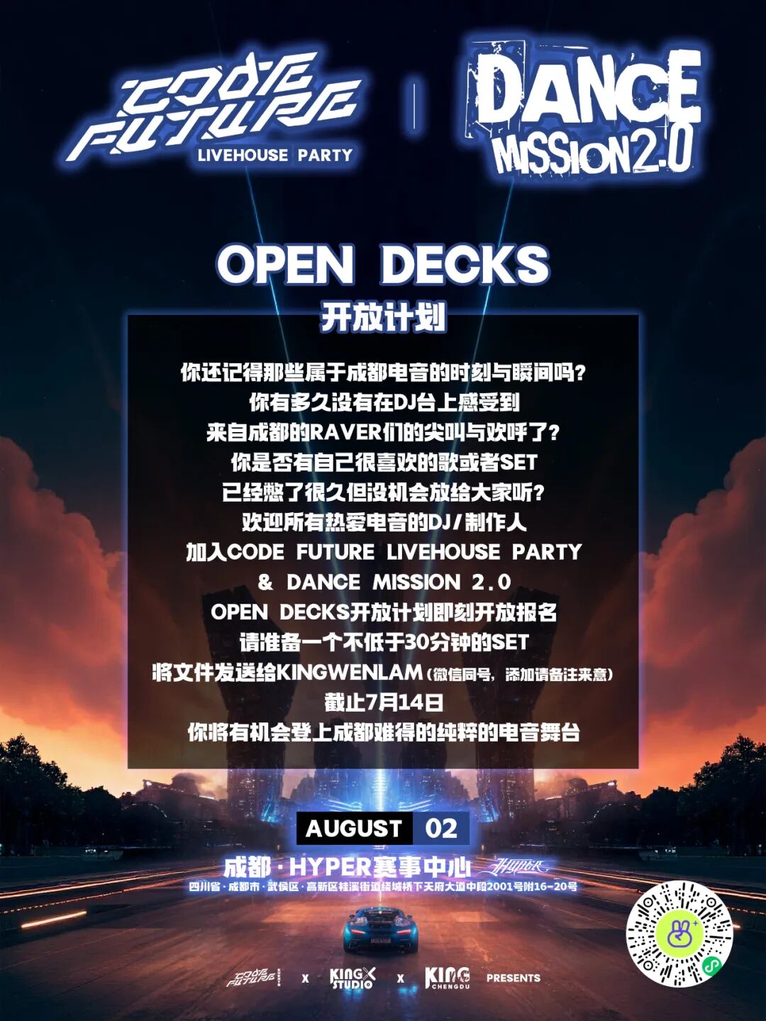被Skrillex在2025年疯狂支持疯狂打Call的法国男人!Roi*、OneCandy、HENL7、Special Program Kingwen Lam Video Set、Open Decks(四组DJ兼制作人或纯DJ)Code Future Events、KXM Chengdu、KXM《Code Future Livehouse Party》暨《Dance Mission 2.0》超前早鸟票99元、第二阶段超前早鸟票109元、限时不限量·早鸟票119元、限时不限量·预售票139元、限时不限量·正价票159元、限时不限量·三人通行票439元、门口·现场票189元