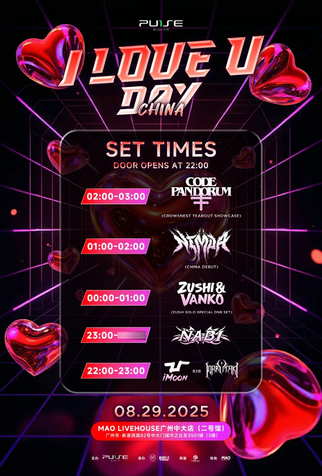 Nimda(China Debut)、Code: Pandorum(Crowsnest Tearout Showcase - Special Tearout Set)、Zushi&Vanko(Zushi Solo Special DNB Set)、Nabi、iMoon B2B KORKUTAKI-黑太木1Pulse Events美国总部、1Pulse China