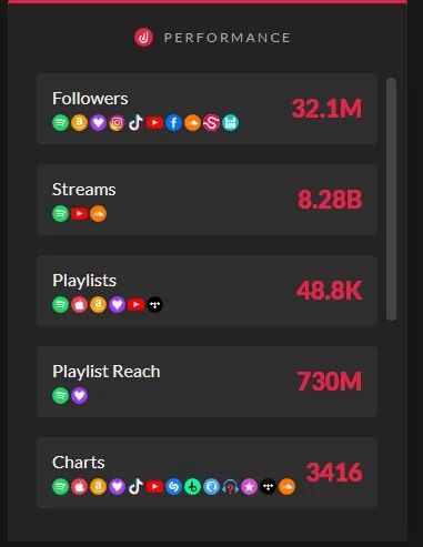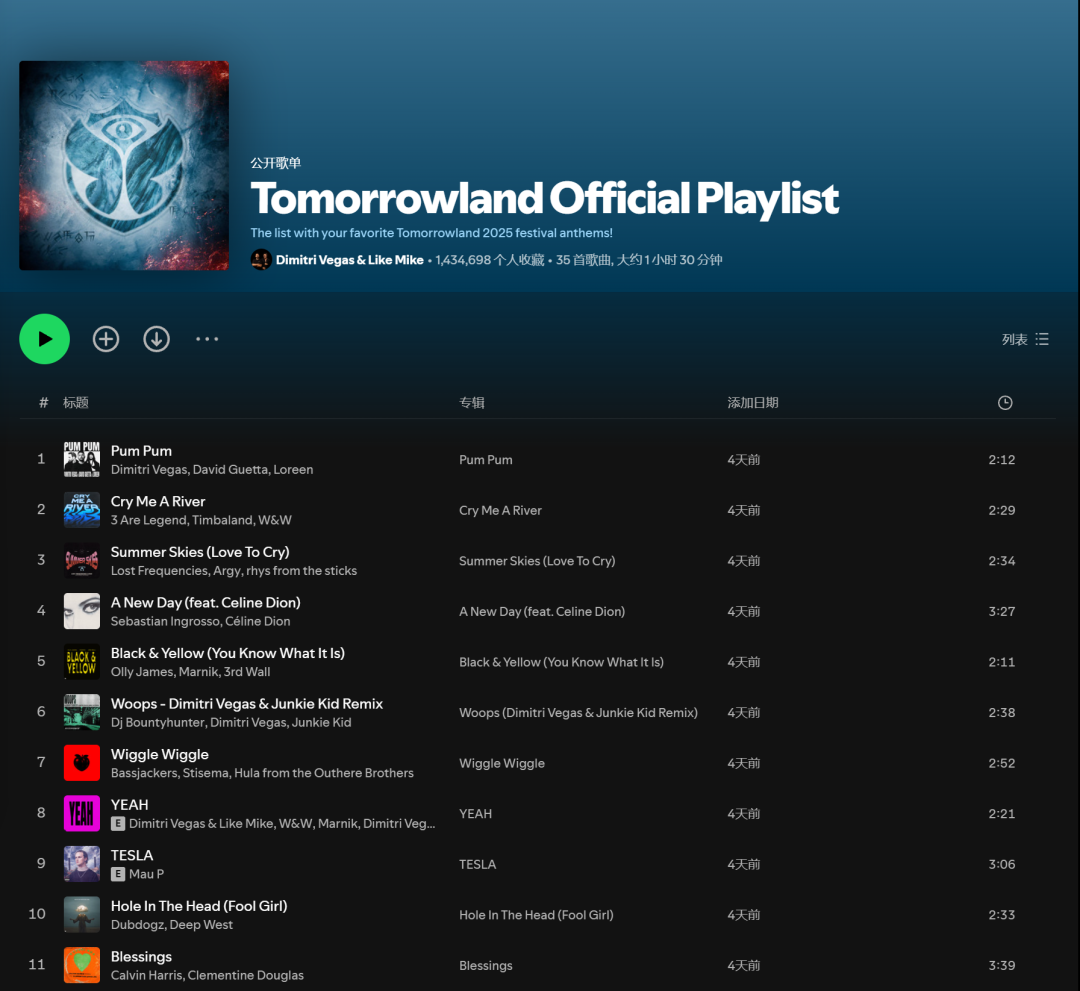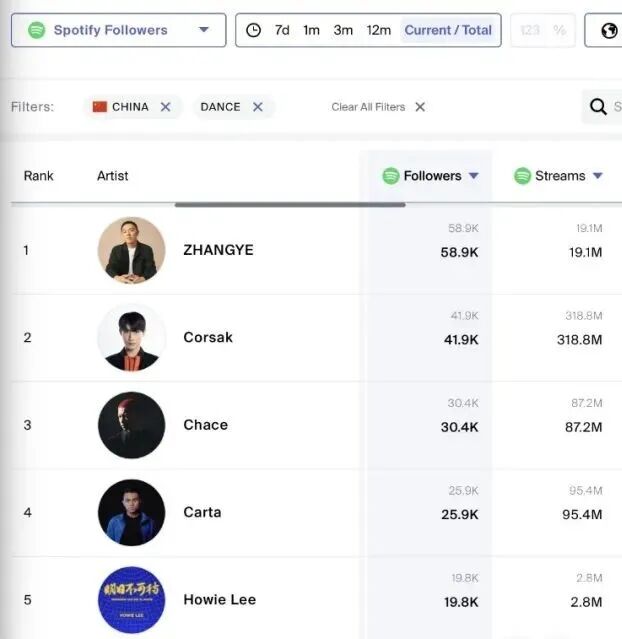 但很抱歉,这个事实可能伤到你,但你迟到都要意识到问题的存在。DJ们的相互推广,DJ们线下的音乐支持和对其喜欢作品的“打Call”,本是早就在海外很成熟的文化体系,在国内的电音圈,专业的DJ/电台/俱乐部甚至没听说过,更是很少听说有国内DJ们玩儿“DJ互助”,一首新歌一发行,全国DJ们便响应号召在演出中播放,后更多人形成互助形式,雪球越滚越大。图片来自520 I Love U Day三组国际巨星 图片版权属于原主为什么国内的电音圈没有这个现象?一方面是,DJ Promo的线下推广模式,“说白话”便是侧重于这种演出推广、线下推广的路径,在中国几乎没有人科普、没有人推广过,只有极少数DJ/制作人听说过DJ Promo这个词组。图片来自Spotify Dance排名 图片版权属于原主另一方面是,中国DJ们普遍有点太“江湖”了,谁都觉得自己是天下第一,谁都瞧不起同行,或者至少也瞧不起大多数的同行,只认可极少数自己主观上觉得“喜欢”的音乐人/制作人,这就导致哪怕某日的未来,DJ Promo这个词组在中国普及了,大部分人也不会主动去做。图片来自520 I Love U Day 图片版权属于原主海外电音圈、电子舞曲圈(字面的/广义的,“上”同)这套“相互支持”的体系很成熟,是因为DJ们不仅仅只是DJ们,他们都还是非常成熟而且靠音乐吃饭、靠作品吃饭的正经制作人。每当自己的DJ朋友/同厂牌的兄弟发新歌,都会主动支持。既然认可,为何不能“互播”呢?图片来自Dimitri Vegas & Like Mike Songstats 图片版权属于原主除了这种“朋友间”的支持,偏商业传导、商业传播的DJ Promo系统也非常完善,除了你自己周围的、你认识的DJ和音乐制作人,还能将歌曲Pitch给电音圈各个级别的DJ,只要他们真的喜欢你的作品、认可你的作品,答应在某些演出中表演你的音乐,绝不只是想象。同样做“白人音乐”“黑人音乐”,不是本土作品不行,而是现在本土的文化接收有问题。图片来自Dimitri Vegas & Like Mike 图片版权属于原主至目前,作者在过去十年内听说的,有去正儿八经地做DJ Promo这项工作,DJ朋友们包括去与明星级、巨星级之间相互打Call、相互支持的,除了ZHANGYE外,明显的例子也就只剩下华裔的、中国唯四与国际大厂牌签署过独家唱片约的Carta,加拿大留学过的7Grams。