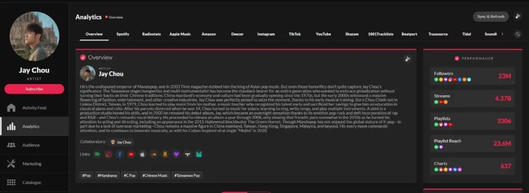 我们说的国际超级巨星,是指体量等于或大于C-Pop头部周杰伦、K-Pop头部权志龙的“超巨DJ/制作人”。周杰伦在全球全平台的粉丝数大约为2000多万,权志龙则大约在3000多万,举个大家很可能嗤之以鼻的“EDM OG”例子,Steve Aoki的全平台粉丝近5000万。