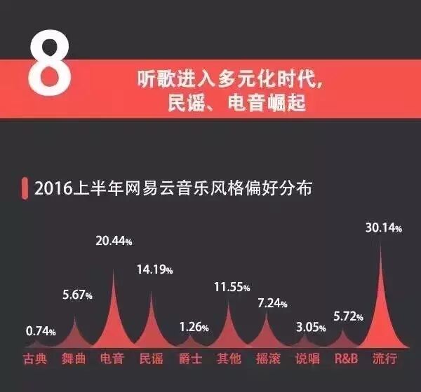 这张图我还是有些话想说,网易云的音乐风格标签里将“舞曲”和“电音”做了区分。而其实舞曲是一个属于电子音乐范围内的曲风统称,也就是说严格意义上,这个数据应该呈现舞曲/电音的数值为26.11%,而不是分开统计,离流行音乐的30.14%已经不远了。