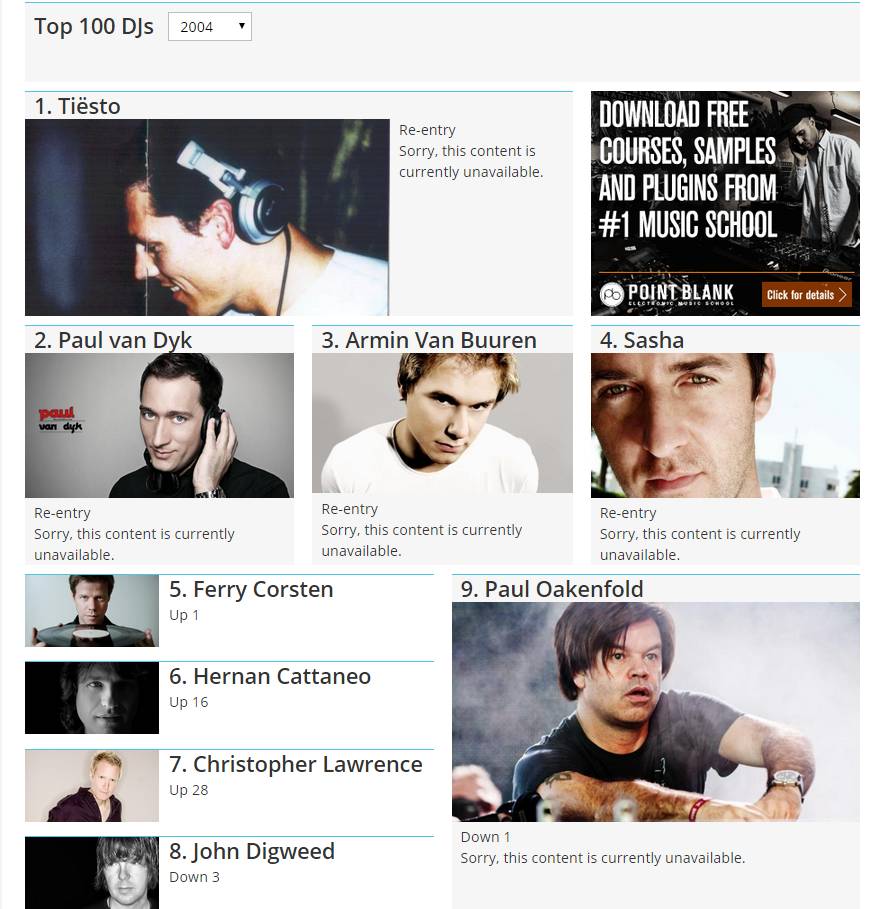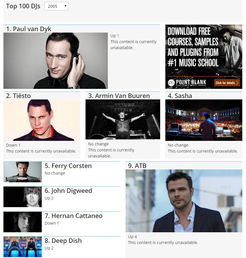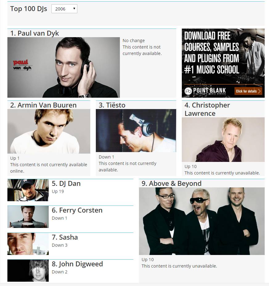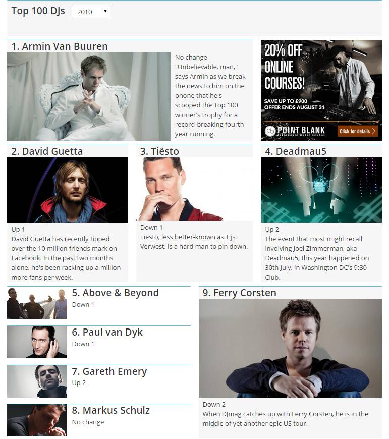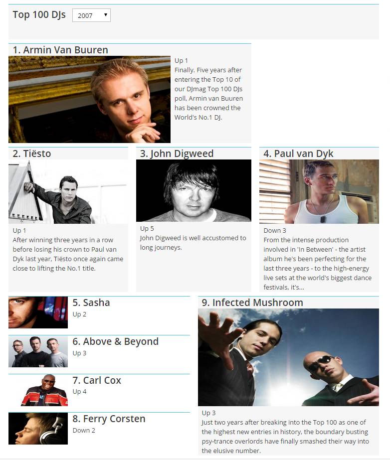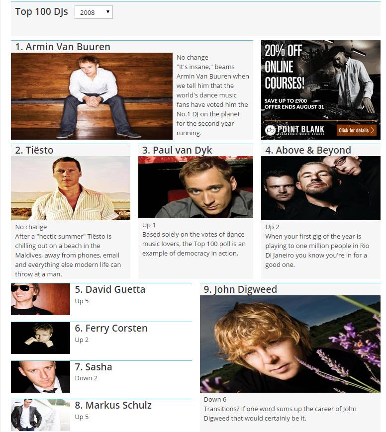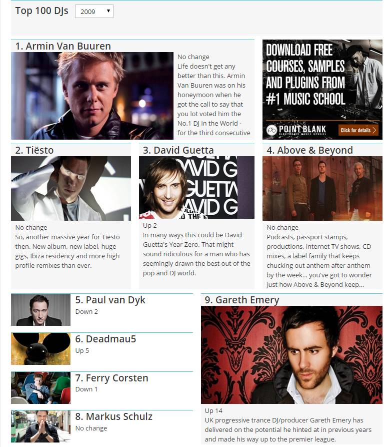 如果单纯地拿音乐的播放量/搜索量和主观意识来告诉各位以前House根本不是那么红,Trance才是电子音乐曲风当中的领头羊,那么可能对于不少人而言说服力不强。那么我们就拿所谓的百大DJ,这个大家都知道,但一半的人爱,一半的人恨的电子音乐榜单来回顾一下当时的情景: