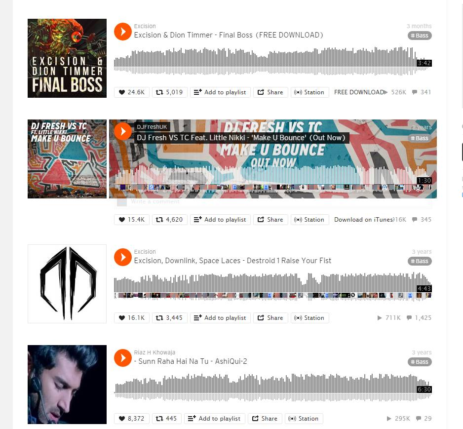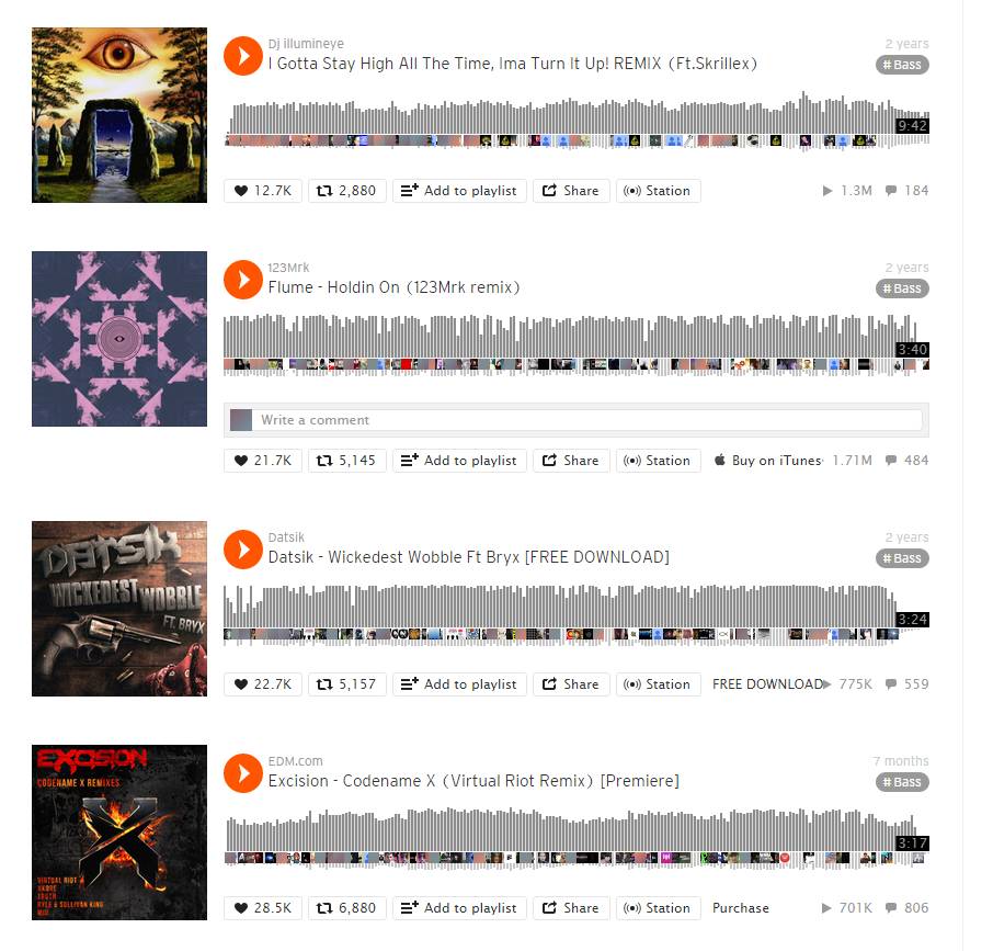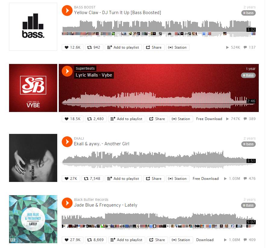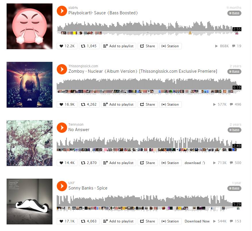 所以我们来论证一下,现代电音爱好者或者电音制作人口中的Bass音乐到底指哪些音乐风格。我们使用全世界最大的音乐软件Soundcloud来论证一下术语使用习惯,看看我们在Soundcloud上找到的20首Bass音乐具体是什么音乐风格。