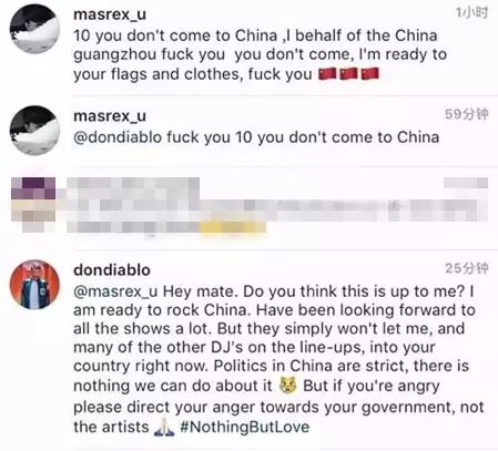 讲真,这翻译有点硬,但语法问题太大了,甚至可以说是病句,只能这么翻译。不过也不难看懂,毕竟字里行间的意思还是能达成的。Don Diablo做出的回应更加精彩。“嘿朋友,你觉得怪我咯?我都准备好Rock中国了,期盼已久并且为这几场演出做了很多准备。但是他们签证不让我过,还有很多在阵容上的其它DJ们也一样,去不了你的国家。中国太严格了,我们也没办法。但是你应该气愤的是整治,而不是艺人们”。