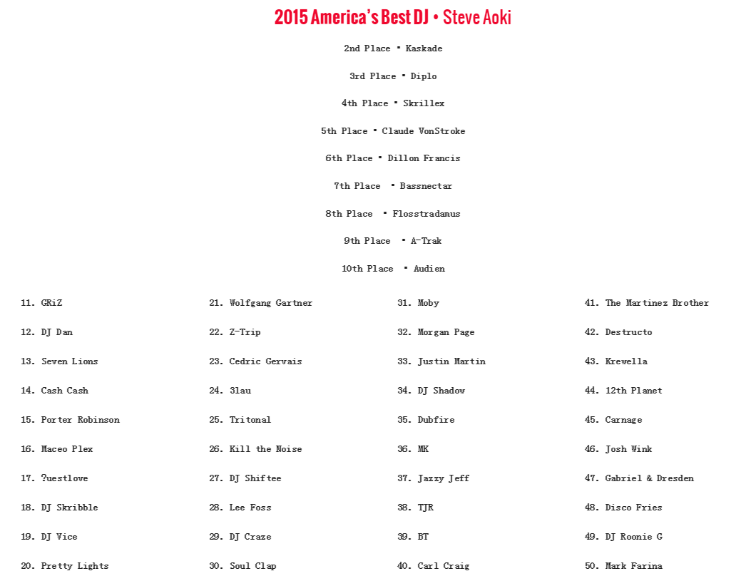 那么这个榜单正确的名字叫什么呢?原名是《America’s Best DJ》,即美国最佳DJ排行榜。至于DJ只是职业不是音乐风格也不需要再重复解释一次(国内一半的人都是土嗨?土嗨是什么意思?)。因为这类榜单有很多,可不单单只有DJMag的百大DJ。与之不同的是,这个榜单专门针对美国DJ。
