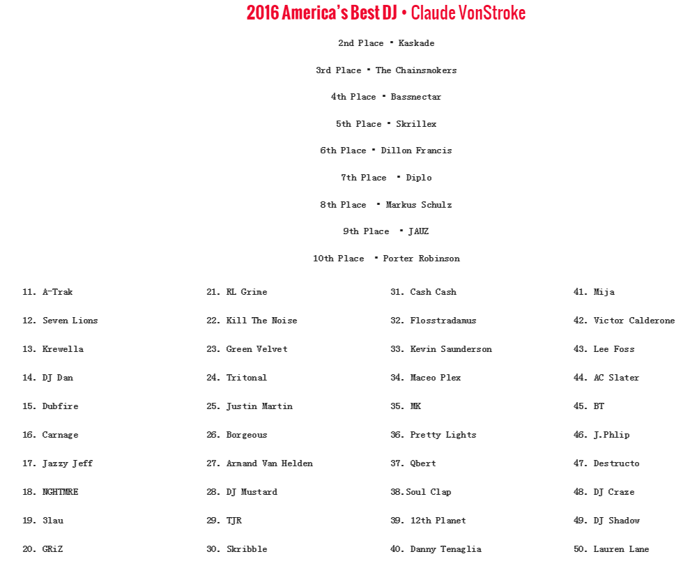 榜单的艺人或许有许多是大家不认识的,但大部分还是比较熟悉。第一名是Techno制作人&DJ Claude VonStroke,不得不说尽管今年Techno在全世界真是爆红,国内都经常有国际Techno艺人前来演出。不过Techno这个圈子的爱好者以及艺人一直都在把Techno直接与地下电音划等号,在他们看来地下不是统称,而是特指。Claude VonStroke登上第一令人意外,我们看看完整的排名。