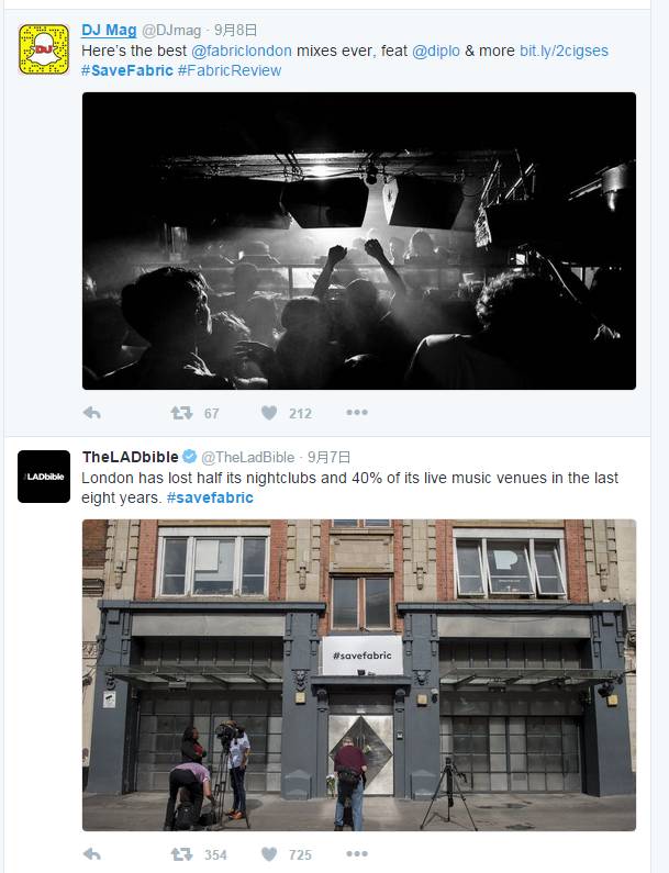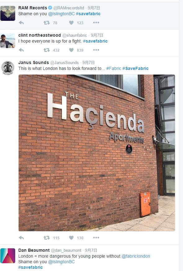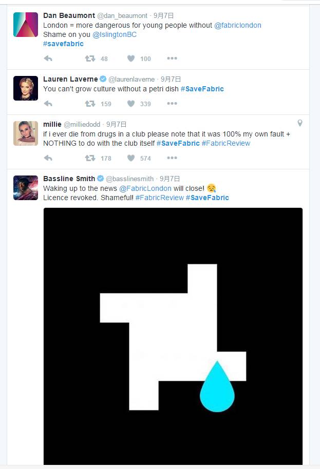 推特上也是炸得一团糟,所有人都不愿意看着Fabric死去,它承载着很多电子音乐爱好者的希望。Savefabric成为一个热门话题,大家都不希望这家夜店被永久关闭,官方账号在Facebook和instagram下的评论更是看得出民众有多爱它。