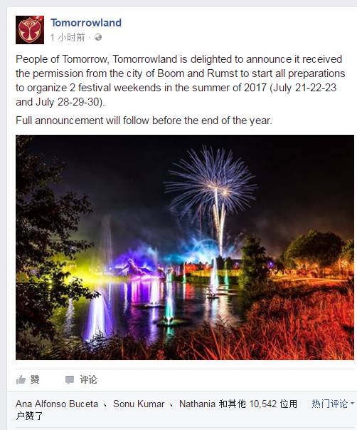 就在今天,Tomorrowland官方发布了一则大好消息,你还不知道?没关系,幸好你关注了电子音乐资讯(Tomorrowland曾离你那么近,你竟然不知道?)。先翻译一下。“People of Tomorrow,Tomorrowland很高兴宣布它收到了权限启动的所有准备工作,将于明年夏天7月21至23日,7月28日至30日组织两个周末。完整的消息将在今年年底跟进”。People of Tomorrow是惯用的开头语。