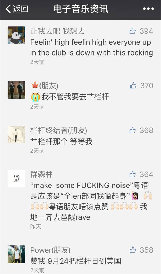 这次我们送出的五张门票已经拉下帷幕,集赞过程十分激烈(福利:发出迟到的中秋祝福的正确方式是什么?)。再次证明广东一带的电音爱好者的的确确是有很多,前五名都获得了数百赞数,在积极参与之后下定结论。截止至今天17:30,也就是写这篇文章的时间。恭喜以下五位获得我们赠送出的Mad House门票各一张。尽快将你们的名字/电话发送至我们公众号,门票为电子票形式,可直接凭名字/电话入场。