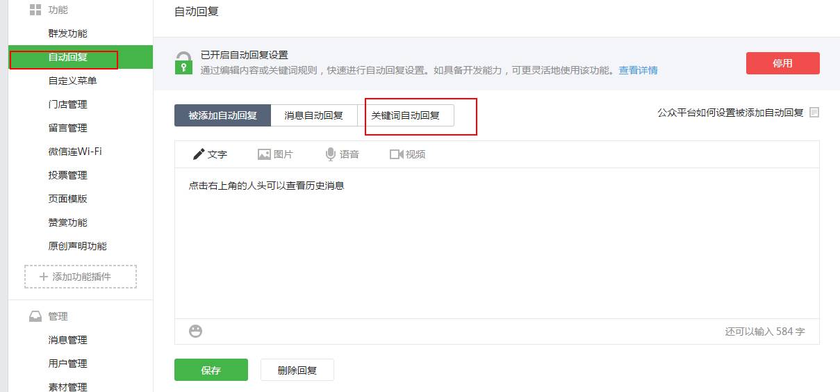 又是一个被公众号粉丝问到我作呕的问题,真的不是因为懒得做而不做,而是各位似乎不知道所谓的关键词自动回复对公众号没有任何好处又特别繁琐。我们直接步入主体了解一下如何做关键词自动回复。首先进入“自动回复”里面的“关键词自动回复”功能。