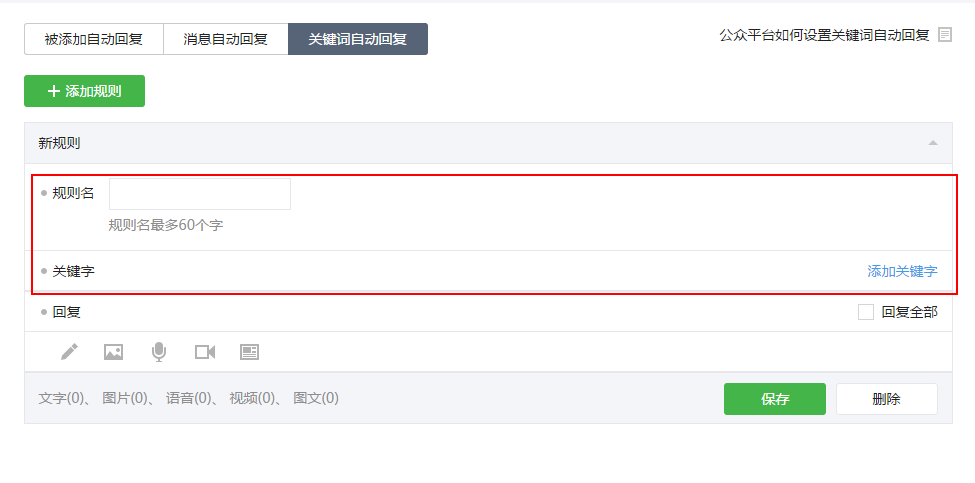 添加规则必须手动添加每一篇文章的一大堆关键词,微信公众号是没有为我们开放自动搜索功能的,每篇文章都需要重新做一次,然后添加一大堆可能匹配的关键词。