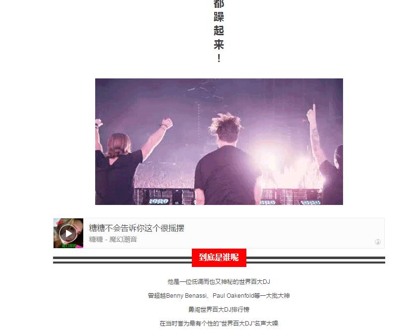 看起来好像很厉害的样子,但是“DJ Aelx”又是怎么鬼?百大DJ上从来没有这个人,他不单不是知名DJ,甚至连音乐制作人都不是。看看他到底是如何一下子冒充四个人的。首先这个公众号的文章总会放一些盗歌蛤蟆的单曲,也就是说这家夜店也许自己没有盗歌,但长期都是盗歌蛤蟆的粉丝。糖糖是跟7妹/虞姬一样众所皆知的所有歌都是直接拿别人的单曲改个歌名的三大盗歌蛤蟆之一(电音界败类:盗歌蛤蟆)。