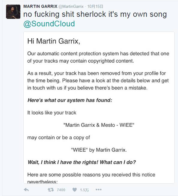 Marin Garrix受到删除通知是因为系统检测到他的《WIEE》盗了他的《WIEE》,这不是病句,这就是整件事最好笑的地方。Marin Garrix盗了Marin Garrix的歌?Martin Garrix直接正面怼,“这就是我自己的歌”。感觉有检测盗歌的系统是好事,不至于有人拿别人的作品说是自己的东西,盗歌比“高仿抄袭”还恶劣。可这实在太乌龙。据称,这七首单曲均为以前演出放过的ID(Martin Garrix用你看不懂的方式说出了自己的小秘密)。