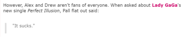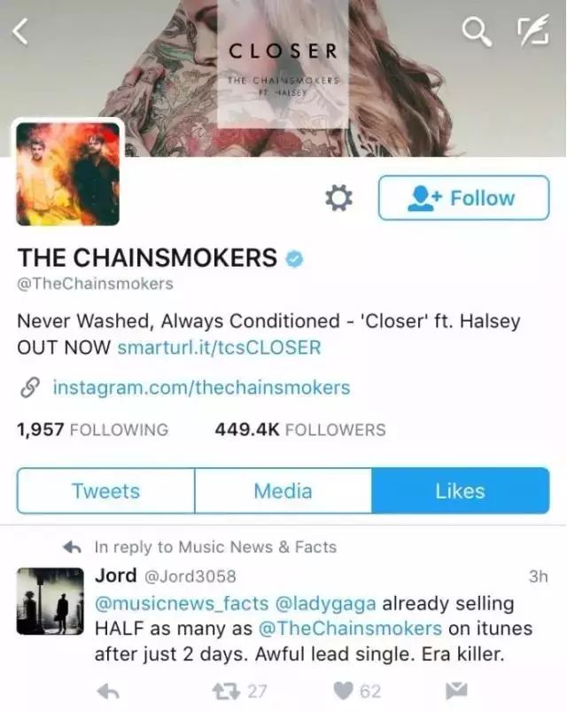Lady Gaga曾经确实也是无人不知,小时候听Dance-pop那会儿没少听她的歌,不过人家也到夜店演出的,门槛要比The Chainsmokers低得多。现在刚回归的确也斗不过The Chainsmokers,面对滚石杂志的采访问到“你觉得Lady Gaga的新歌怎么样”,The Chainsmokers直接回答“它很烂”,这已经不是第一次怼Lady Gaga,之前他们也点赞了相关的Lady Gaga负面推特内容。反正不怕死,就是干。