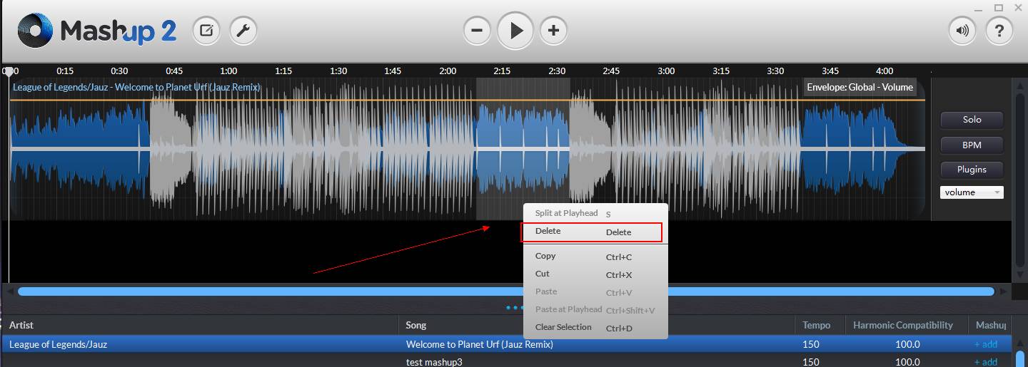 除了用来制作Mashup以外,用来做剪裁也是完全没有问题的,因为本身就带有这样的功能为了Mashup服务。不管你是想剪掉哪个部分,包括搞所谓的“无空拍”,把对应的片段剪掉就可以了,特别简单。只需要直接通过鼠标拖动需要剪掉的部分,右键Delete,再拖动波形即可。如果想传到音乐网站,记得在歌名后面打上(Radio Edit)而不是将原制作人改成自己,因为那是盗歌(我们来扒一扒所谓全国最火的盗歌网站MixDJ)。