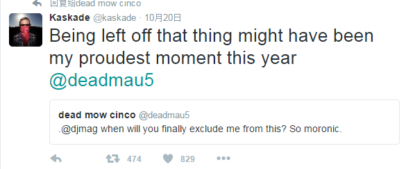 Deadmau5在前几天第无数次怼DJ Mag,并且提到“什么时候才能让我不再出现在这个榜单上”,这是我们说过的事,就像上个自然段一样只是用新的话复述(DJ Mag 2016百大DJ排行榜已出炉 说点不一样的)。Kaskade随后在Twitter上转发Deadmau5的推文,表示“离开这个榜单是我今年最骄傲的事”。