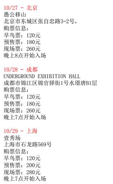 又有福利?还是送门票,虽然门票已经极其稀有,不知道如果连最后仅有的一部分现场票也售罄之后会涨到什么价格,但我们还是为爱我们的读者准备了厚礼。回归最原始的赠票模式,你只需要在文章底部留言区写留言,并且想办法让更多人赞你。数据截止到10月24日18点,获得赞数最多的两位分别获得门票两张,可自选其中一站,积极参与的同时记得关注开奖文章。