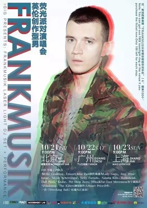 10月21日到10月23日,Frankmusik首次来到中国演出,一下子跨距北京/广州/上海三站,Frankmusik的演出从唱歌到打碟,让不少人知道原来他还是一名DJ。听起来本来是好事,可主办方却在演出之前发文章哭诉三站一共只卖了不到一百张门票。也许是名气原因,虽然不知道在这篇文章之后经过一些推广有多大的进展,但据说上海站只有大概两百多人,无疑这次演出是亏本的,我们只能祝愿Frankmusik下次来中国会更好。