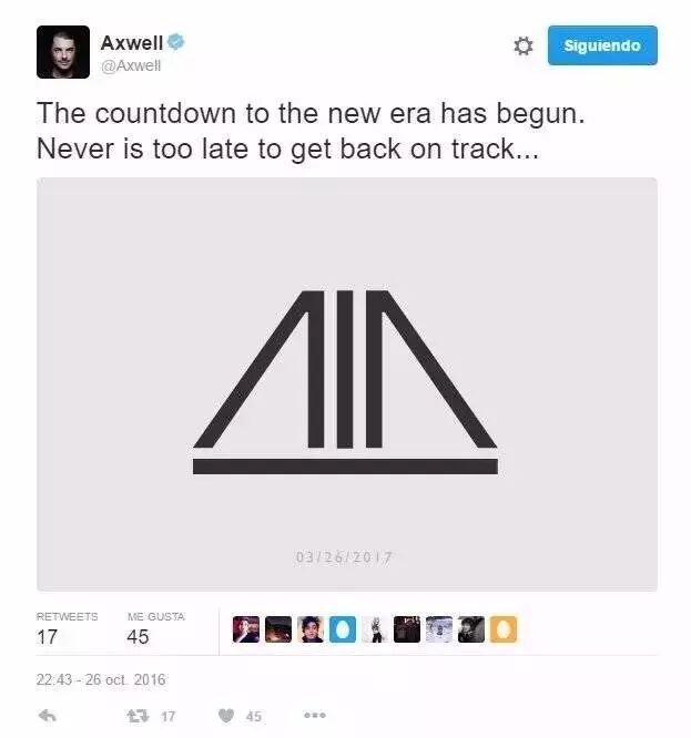 就在前天,大量西方媒体开始大传其中成员之一Axwell在推特上公布“新时代开始倒计时,回归从来不会太晚”并配图2017年3月26日代表回归时间。这则消息很快在全世界的电音爱好者之间传开,曾经的铁粉纷纷按耐不住开始欣喜诺狂。即使是萌新,喜欢Progressive House/Electro House的电音爱好者也会开心得睡不着。