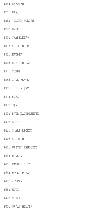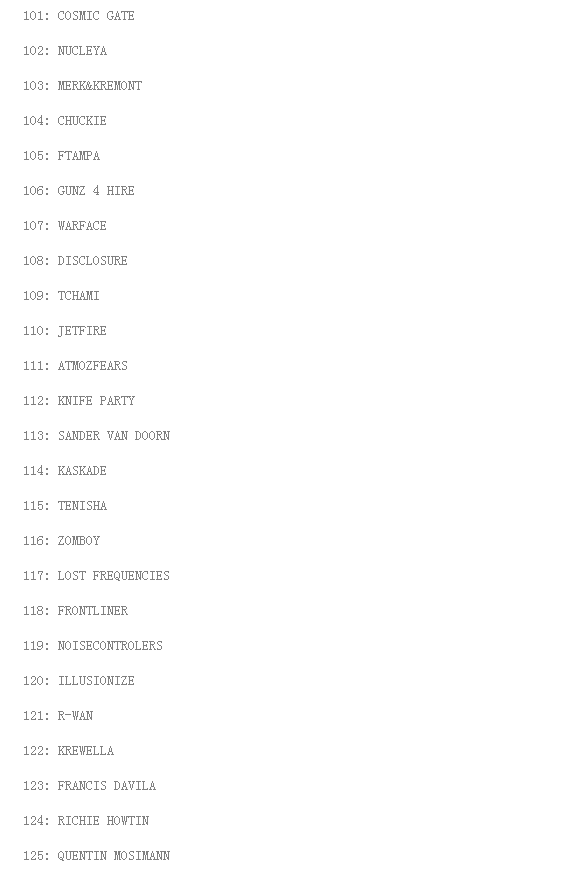 就在昨天,DJ Mag公布了百大DJ排行榜前一百名以外的101~105情况,看看有没有可能你喜欢的艺人没有上榜但是却在150名以内呢?这或许是很大的安慰。但是说实话,这101到150的艺人反而让我觉得水分更加浓烈了,一大群社交网络粉丝数只有十几万的,那群几百万粉丝的很多该上榜还是没上榜。
