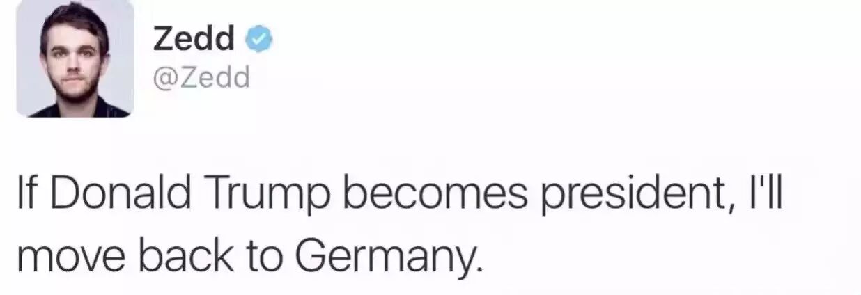 在我们国家言论自由还是有一定的限制,有些MV露了川普的脸直接就审核不通过了。不过西方这件事早就已经闹成一片,褒贬不一,跟我们圈子有关系的就例如Zedd,这次真要搬回德国了。