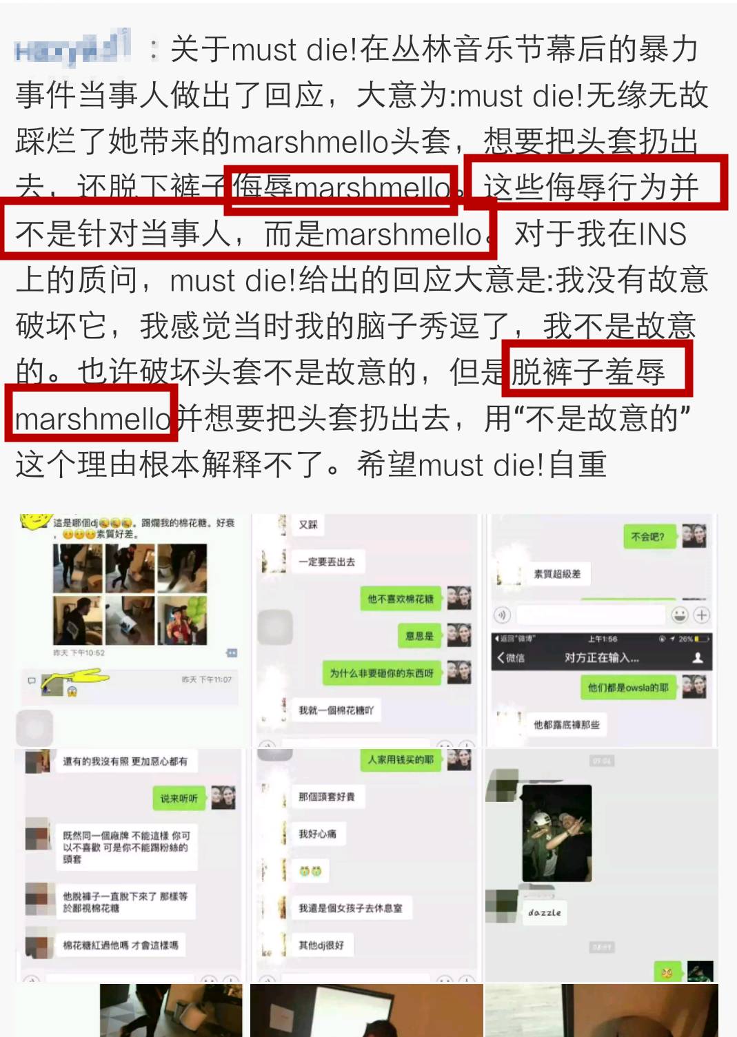 本身错就错在这位Marshmello粉丝,但她竟然还把整件事造谣得南辕北辙,说“因为Must Die!讨厌Marshmello所以才这么做”“Must Die!踩坏她的头套是因为讨厌Marshmello而不是因为讨厌她”。我想说作为Marshmello的粉丝,你把整件事扭曲得一塌糊涂/挑拨离间难道不是给Marshmello招黑?明明Must Die!和Marshmello就没有矛盾,明明Must Die!就是针对你而不是Marshmello。谣言止于智者,是谁的错各位自己辨别。