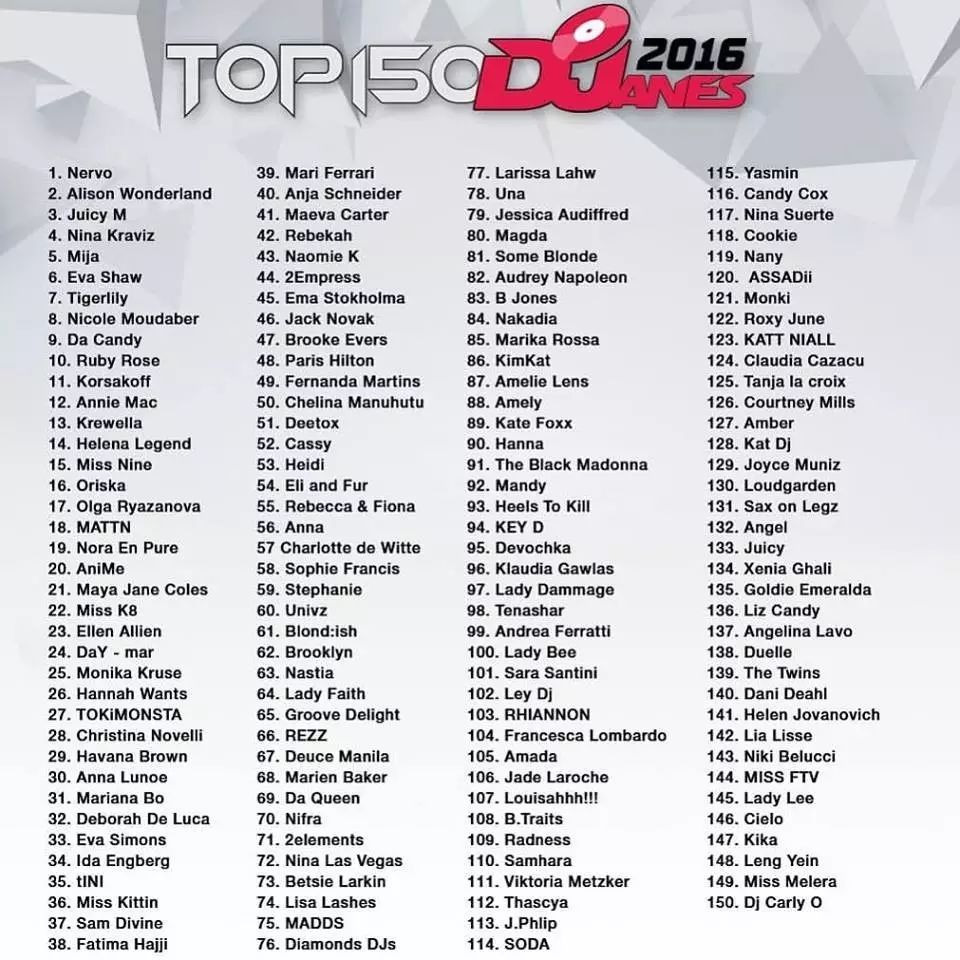 101到150名没啥好总结的,反之肯定还没前一百名权威,感觉好像买榜的有不少,毕竟对于DJanes Mag我不熟悉,也没有确定的消息来源,所以只是可能。可以肯定的是一半以上不是音乐制作人,社交网络粉丝绝大部分只有几万甚至几千,在世界上有很多比她们知名的女DJ并不在榜单上。毕竟DJanes Mag也不是什么家喻户晓的网站,看看就好,可别真拿它给人分三六九等。