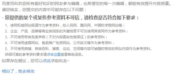 但这不是问题所在,最大的毛病在于百度百科对词条的审核方式。谁都可以编辑是没错,不过编辑之后是需要审核通过才能显示的,这个时候问题就出现了。百度竟然觉得官网/免责网站/带有推广性质的网站/公关/微博/各类百科/博客/论坛都算不可信的参考资料,只有人民网/腾讯网等新闻网才算可靠的参考资料。众所皆知像电子音域等专业领域,各大新闻网写出来的都是狗屎,将其作为参考资料当然均为误导。